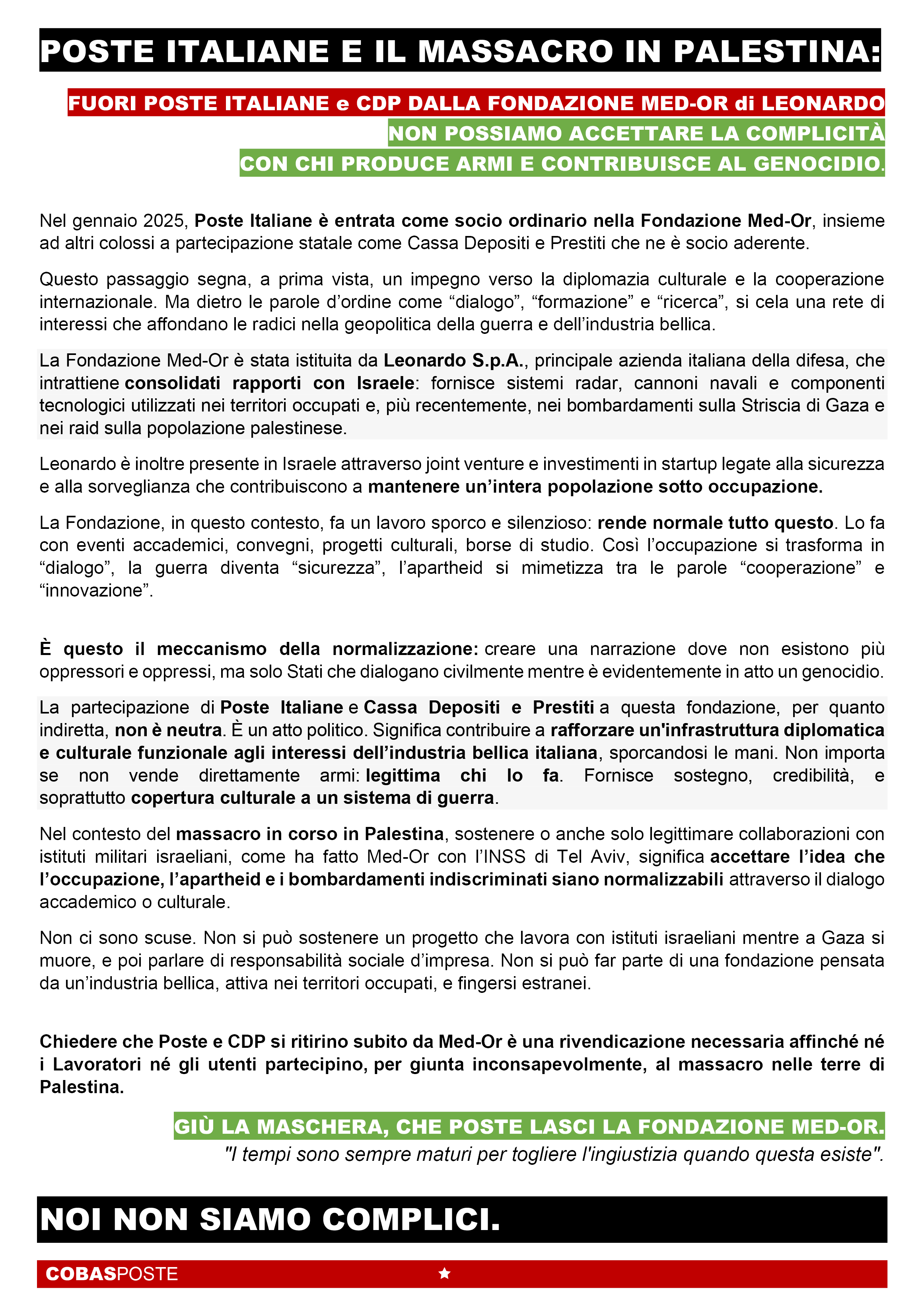 FondoPoste, il fondo pensione dei lavoratori postali, non è solo un semplice strumento di risparmio previdenziale. È un ingranaggio che lega i nostri contributi alle logiche speculative dei mercati internazionali e, oggi, all’economia del genocidio in Palestina.