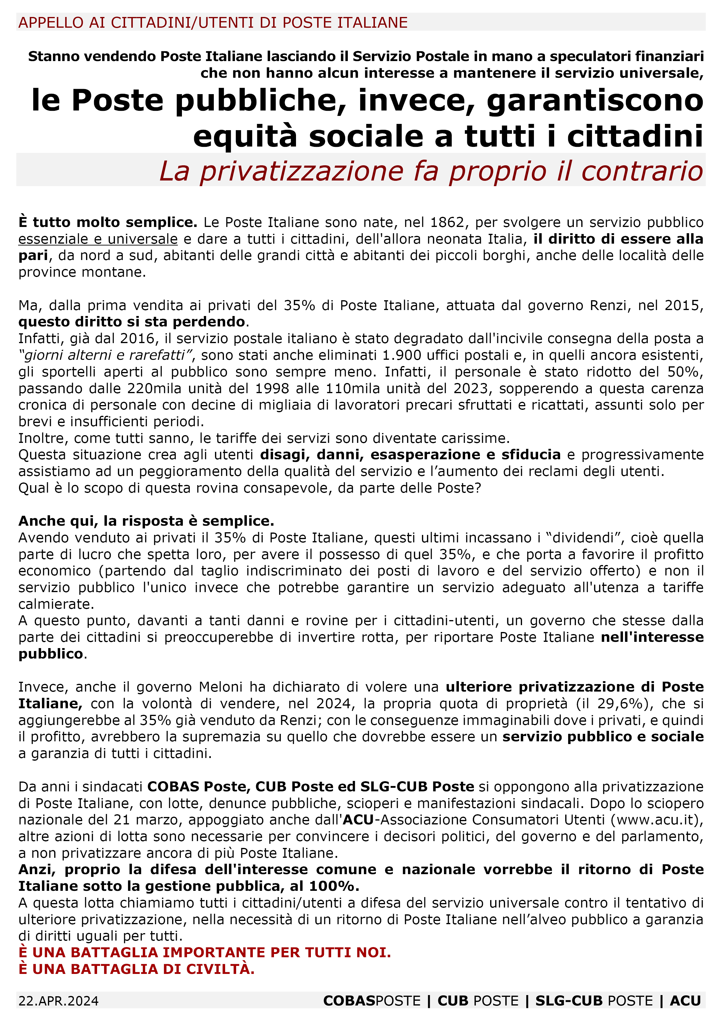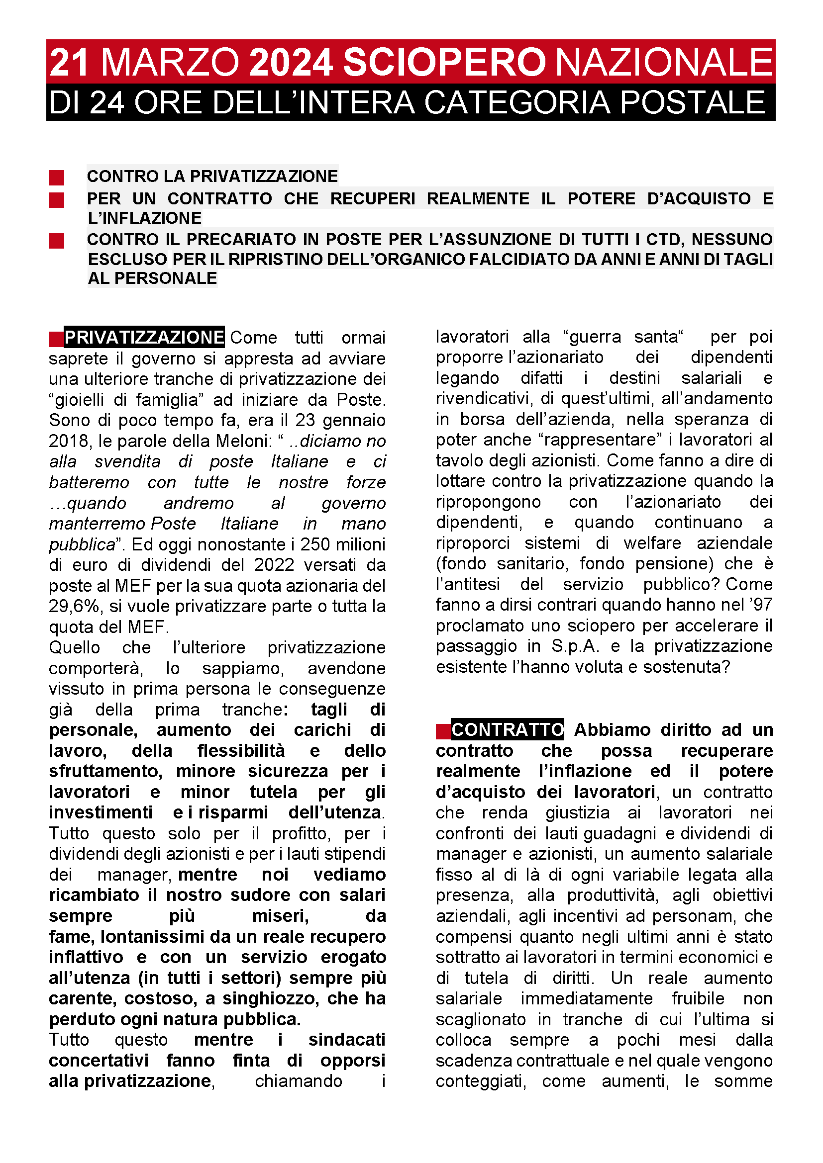 La imminente tranche di privatizzazione delle Poste voluta da governo e concertativi.