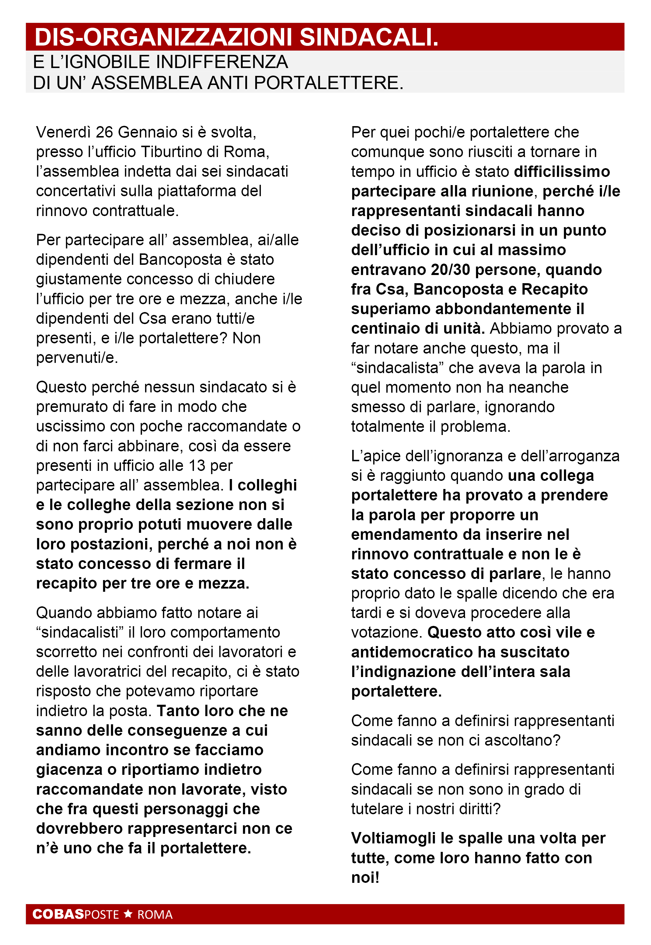 Cosa ne sanno di discussioni, di dibattiti, di sintesi, di levatacce alle quattro di mattina, di stampe domestiche e di volantini distribuiti, cosa ne sanno quelli che hanno provato a boicottare lo sciopero di ieri, come boicottano da sempre le nostre azioni. Cosa ne sanno di “partecipazione dei lavoratori” se ne parlano in termini di azionariato pur dicendosi ipocritamente contrari alla privatizzazione di poste.