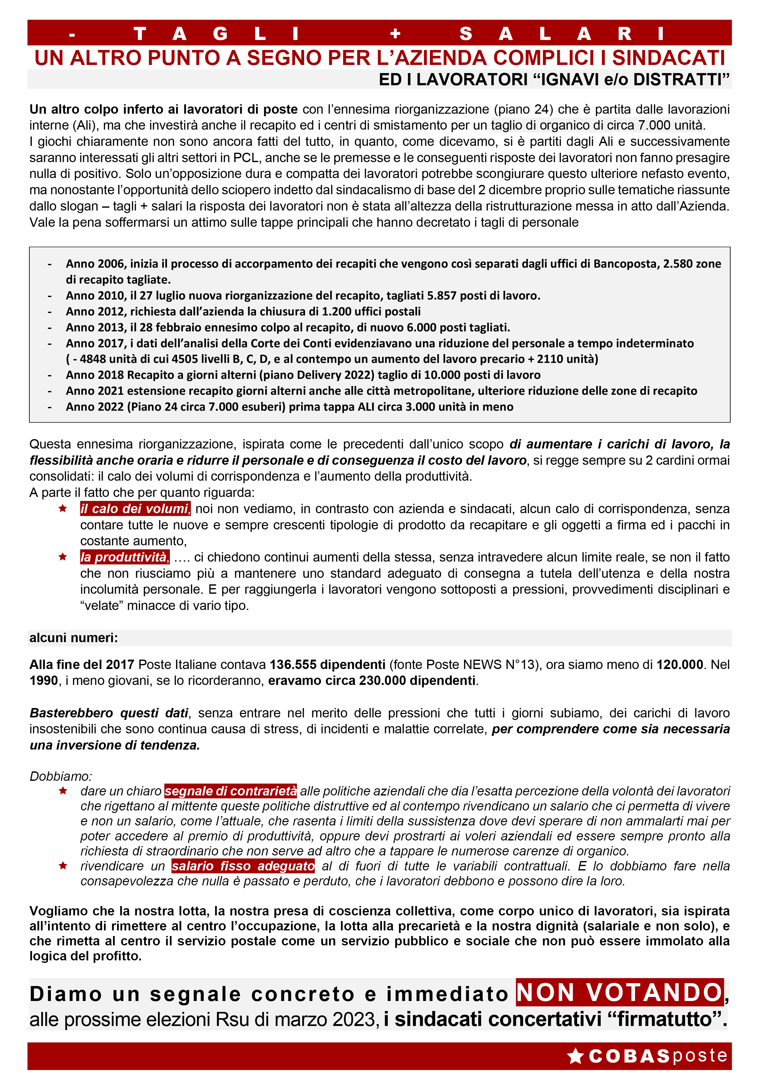 Sia al recapito che alla sportelleria poste procede da anni al taglio sistematico del personale necessario all’aumento dei ricavi per manager ed azionisti con conseguente aumento dei carichi di lavoro, delle responsabilità, delle pressioni da parte di ram e filiali, dei rischi legati alla salute e sicurezza.