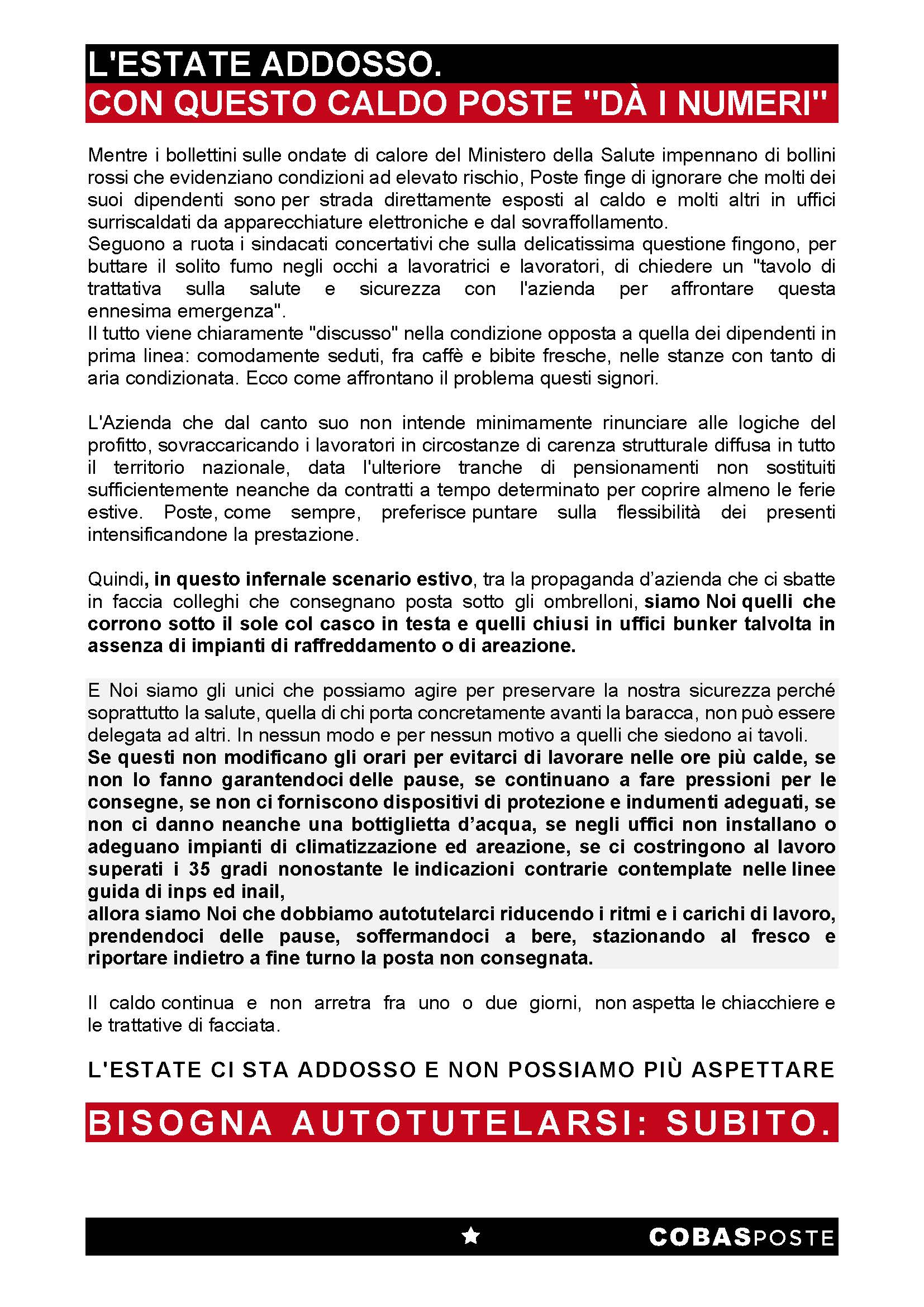 Mentre i bollettini sulle ondate di calore del Ministero della Salute impennano di bollini rossi che evidenziano condizioni ad elevato rischio, Poste finge di ignorare che molti dei suoi dipendenti sono per strada direttamente esposti al caldo e molti altri in uffici surriscaldati da apparecchiature elettroniche e dal sovraffollamento.