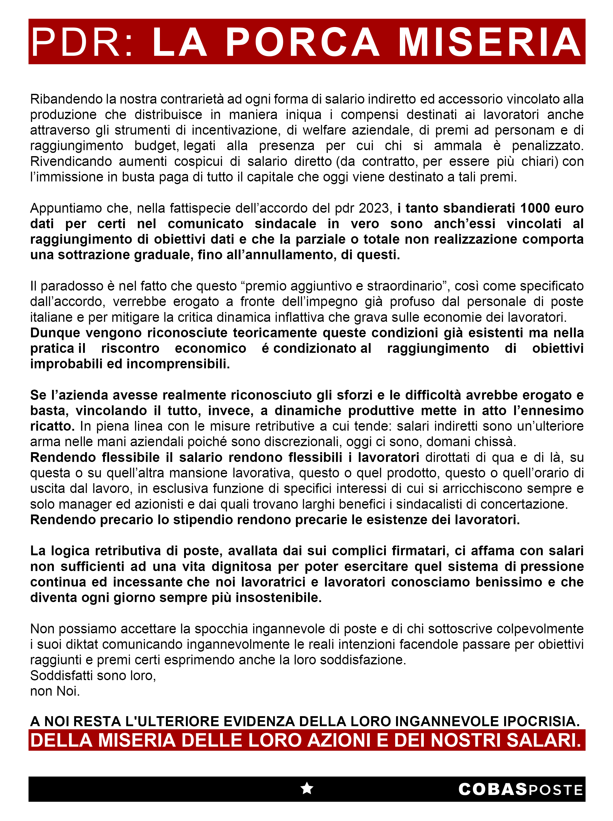 Appuntiamo che, nella fattispecie dell’accordo del pdr 2023, i tanto sbandierati 1000 euro dati per certi nel comunicato sindacale in vero sono anch'essi vincolati al raggiungimento di obiettivi dati e che la parziale o totale non realizzazione comporta una sottrazione graduale, fino all'annullamento, di questi.